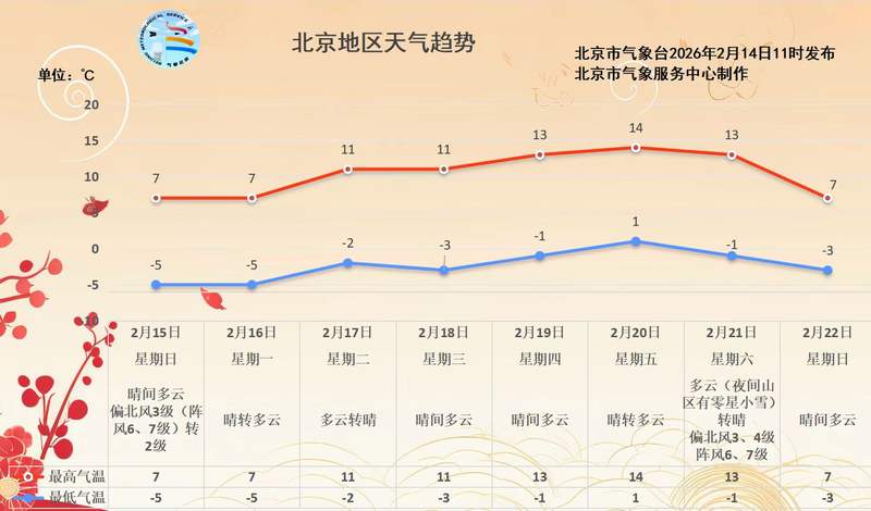 市气象台发布了大风蓝色预警信号,门头沟区和房山区发布了大风黄色预警信号,请注意防风防火,谨防高空坠 物。 气温方面,今天午后最高气温还能升至15℃上下,夜间最低气温在-1℃左右。早晚气温低,体感很冷,还请做好 保暖,谨防感冒。 新京报讯 据"气象北京"微信公众号消息,今天天气晴朗,北风已明显增强,下午到夜间北京市有三四级偏北风, 阵风七级左右,山区阵风更加强劲,可达九级以上。 明天白天仍有三级左右偏北风,阵风六七级,预计傍晚前后风力逐渐减小停歇。在冷空气的影响下,明天气温明 显下降,白天最高气温回落到7℃左右,夜间最低气温在-5℃左右。北风呼啸,气温下降,风寒效应明显,出行还 请注意防风防寒。 明天过后,春节长假期间天气以晴到多云为主,大部分时间适宜大家户外活动和交通出行。不过,后期受冷空气 影响,气温有所下滑,请及时关注临近预报。 ...