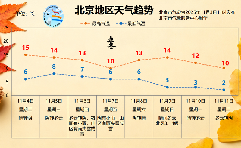 本周大部分时间天空以多云为主,本周前期能见度不佳,特别是明后两天夜间至早晨能见度较低。此外,周四夜 间到周五(6日至7日)有明显降水过程,请关注临近预报变化,及时做好防范。气温方面,本周白天最高气温在 10℃至15℃之间,夜间最低气温在3℃至8℃,请及时调整着装,谨防着凉感冒。 新京报讯 据"气象北京"微信公众号消息,11月2日8时至11月3日8时,南郊观象台最高气温14.9℃(14:23),最低 气温2.1℃(06:32)。 今天白天以晴为主,光照充足,最高气温14℃上下,午后体感较为舒适,适宜大家户外活动。傍晚太阳落山以 后,寒意增浓,能见度也将逐渐转差,夜间及明天早高峰出行注意交通安全。 ...