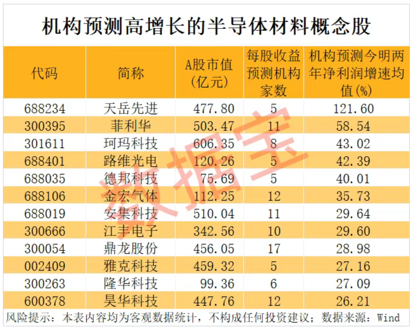 转自:证券时报 人民财讯1月17日电,半导体材料概念取得开门红。二级市场方面,2026年以来,半导体材料相关个股走势强劲。据证券时报·数据宝统计,截至1月16日收 盘,半导体材料概念股今年以来平均上涨21.15%,大幅跑赢同期上证指数、创业板指数、科创50指数等。 据数据宝统计,根据5家及以上机构一致预测,2026年、2027年净利润增速均有望超20%的半导体材料概念股有12只。 这12股当中,以1月16日收盘价与机构一致预测目标价相比,德邦科技、昊华科技上涨空间均逾10%,分别达到39.21%、10.86%。 当前正值年报业绩预告披露期,业绩成为投资者关注焦点。在AI算力、数据中心、智能驾驶等赛道加速扩张的背景下,哪些半导体材料概念股具备高增长 潜力? | | | 机构预测高增长的半导体材料材 | | | --- | --- | --- | --- | | 代码 | 简称 | A股市值 | 每股收益 村 म 预测机构 | | | | (亿元) | 家数 | | 688234 | 天岳先进 | 477.80 | 5 | | 300395 | 菲利华 | 503. 47 | 11 | | 301611 | 珂玛 ...
