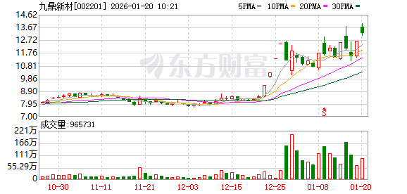 据天眼查APP显示,江苏九鼎新材料股份有限公司成立于1994年06月30日,注册资本65163.6241万人民 币。(数据宝) 近日该股表现 九鼎新材再度涨停,5个交易日内录得3个涨停,累计涨幅为22.50%,累计换手率为76.72%。截至9:33, 该股今日成交量4269.68万股,成交金额5.83亿元,换手率7.09%。最新A股总市值达90.84亿元,A股流 通市值83.92亿元。 证券时报·数据宝统计,两融数据来看,该股最新(1月19日)两融余额为2.89亿元,其中,融资余额 2.89亿元,较前一个交易日增加2519.23万元,环比增长9.55%,近5日累计减少240.94万元,环比下降 0.83%。 公司1月14日在交易所互动平台中披露,截至最新(1月10日)股东户数为74214户,较上期(12月31 日)增加6159户,环比增长9.05%。这是该股股东户数连续第4期增长,也就是说筹码呈持续分散趋 势。 | 日期 | 当日涨跌幅(%) | 换手率(%) | 主力资金净流入(万元) | | --- | --- | --- | --- | | 2026.01.19 | 9.98 | 11.00 | 302 ...
