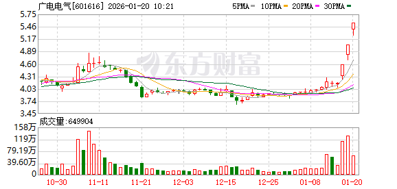 广电电气盘中涨停,已连收3个涨停板,截至9:34,该股报5.54元,换手率6.46%,成交量5511.99万股, 成交金额3.01亿元,涨停板封单金额为3.34亿元。连续涨停期间,该股累计上涨33.17%,累计换手率为 34.93%。最新A股总市值达47.29亿元。 龙虎榜数据显示,该股因连续三个交易日内,涨幅偏离值累计达20%、日涨幅偏离值达7%上榜龙虎榜1 次,买卖居前营业部中,营业部席位合计净卖出1731.06万元。 据天眼查APP显示,上海广电电气(集团)股份有限公司成立于1995年12月12日,注册资本85367.5319万 人民币。(数据宝) 近日该股表现 | 日期 | 当日涨跌幅(%) | 换手率(%) | 主力资金净流入(万元) | | --- | --- | --- | --- | | 2026.01.19 | 10.04 | 15.33 | -8926.13 | | 2026.01.16 | 10.10 | 13.14 | 16548.72 | | 2026.01.15 | 0.24 | 3.80 | 158.17 | | 2026.01.14 | -0.95 | 7.08 | 47.70 ...