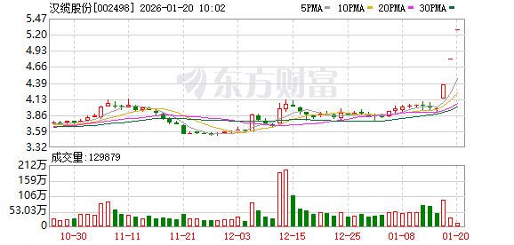 据天眼查APP显示,青岛汉缆股份有限公司成立于1989年11月08日,注册资本332679.6万人民币。(数 据宝) 汉缆股份盘中涨停,已连收3个涨停板,截至9:25,该股报5.28元,换手率0.16%,成交量524.65万股, 成交金额2770.17万元,涨停板封单金额为8.71亿元。连续涨停期间,该股累计上涨33.33%,累计换手 率为3.87%。最新A股总市值达175.65亿元。 证券时报·数据宝统计,两融数据来看,该股最新(1月19日)两融余额为2.21亿元,其中,融资余额 2.20亿元,较前一个交易日减少383.15万元,环比下降1.71%,近3日累计减少602.90万元,环比下降 2.67%。 龙虎榜数据显示,该股因连续三个交易日内,涨幅偏离值累计达20%上榜龙虎榜1次,买卖居前营业部 中,机构净卖出497.50万元,深股通累计净卖出168.78万元,营业部席位合计净买入9336.48万元。 近日该股表现 | 日期 | 当日涨跌幅(%) | 换手率(%) | 主力资金净流入(万元) | | --- | --- | --- | --- | | 2026.01.19 | 10.09 | 0.94 | ...