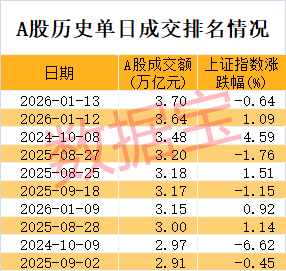 | 日期 | A股成交额 上证指数涨 (力亿元) | 跌幅(%) | | --- | --- | --- | | 2026-01-13 | 3.70 | -0.64 | | 2026-01-12 | 3.64 1 | · 1.09 | | 2024-10-08 | 3. 48 | 64.59 | | 2025-08-27 | 3 20 | -1.76 | | 2025-08-25 | 3.18 | 1.51 | | 2025-09-18 | 3.17 | -1.15 | | 2026-01-09 | 3.15 | 0. 92 | | 2025-08-28 | 3.00 | 1.14 | | 2024-10-09 | 2. 97 | -6. 62 | | 2025-09-02 | 2. 91 | -0. 45 | 人民财讯1月13日电,1月13日,A股成交再破新纪录,截至收盘,全天合计成交3.7万亿元,创下历史新 高。单只股票方面,共有30股成交破100亿元,其中金风科技(002202)、蓝色光标(300058)、岩山 科技(002195)、中国卫星(600118)、航天电子(600879)成交额排在前五位,均 ...