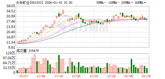 证券时报·数据宝统计显示,大中矿业今日收盘价为28.68元,下跌1.34%,日换手率为2.40%,成交额为 9.22亿元,全天主力资金净流出1040.88万元,近5日该股累计上涨1.81%,近5日资金合计净流出3696.17 万元。(数据宝) 1月15日大中矿业大宗交易一览 大中矿业1月15日大宗交易平台出现一笔成交,成交量950.00万股,成交金额2.49亿元,大宗交易成交价 为26.17元,相对今日收盘价折价8.75%。该笔交易的买方营业部为国金证券股份有限公司北京崇文门外 大街证券营业部,卖方营业部为中信证券股份有限公司武汉建设大道证券营业部。 进一步统计,近3个月内该股累计发生5笔大宗交易,合计成交金额为3.99亿元。 | 成交量 (万 | 成交金额 | 成交价 | 相对当日收盘 | 买方营业部 | 卖方营业部 | | --- | --- | --- | --- | --- | --- | | | (万元) | 格 | 折溢价(%) | | | | 股) | | (元) | | | | | 950.00 | 24861.50 | 26.17 | -8.75 | 国金证券股份有限公司北京 | 中信证券股 ...