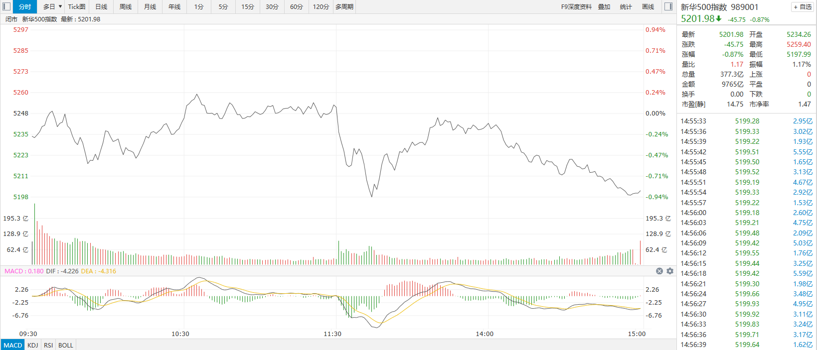 新华财经北京10月30日电(罗浩)新华500指数(989001)10月30日收盘下跌45.75点,跌幅0.87%,报5201.98点。 指数盘中最高触及5259.40点,最低触及5197.99点,成分股全天总成交额报9765亿元,总成交额较上一交易日显著放量。 成分股方面,天华新能涨14.69%,欣旺达涨10.14%,招商轮船、永兴材料、杭氧股份收于约10%涨停,天齐锂业、中远海能、多氟多涨逾6%;药明康德、 安克创新、德业股份、斯达半导、中航光电等跌幅靠前。 (文章来源:新华财经) 走势上看,新华500指数(989001)30日早间小幅低开,指数盘初完成缺口回补后有所下探,跌近0.6%后震荡反弹,此后窄幅整理,至午间收盘时小幅上 涨。指数午后出现较大幅度回落,跌近0.95%后逐渐反弹,上攻未果后震荡下行,收盘时显著下跌。 ...
