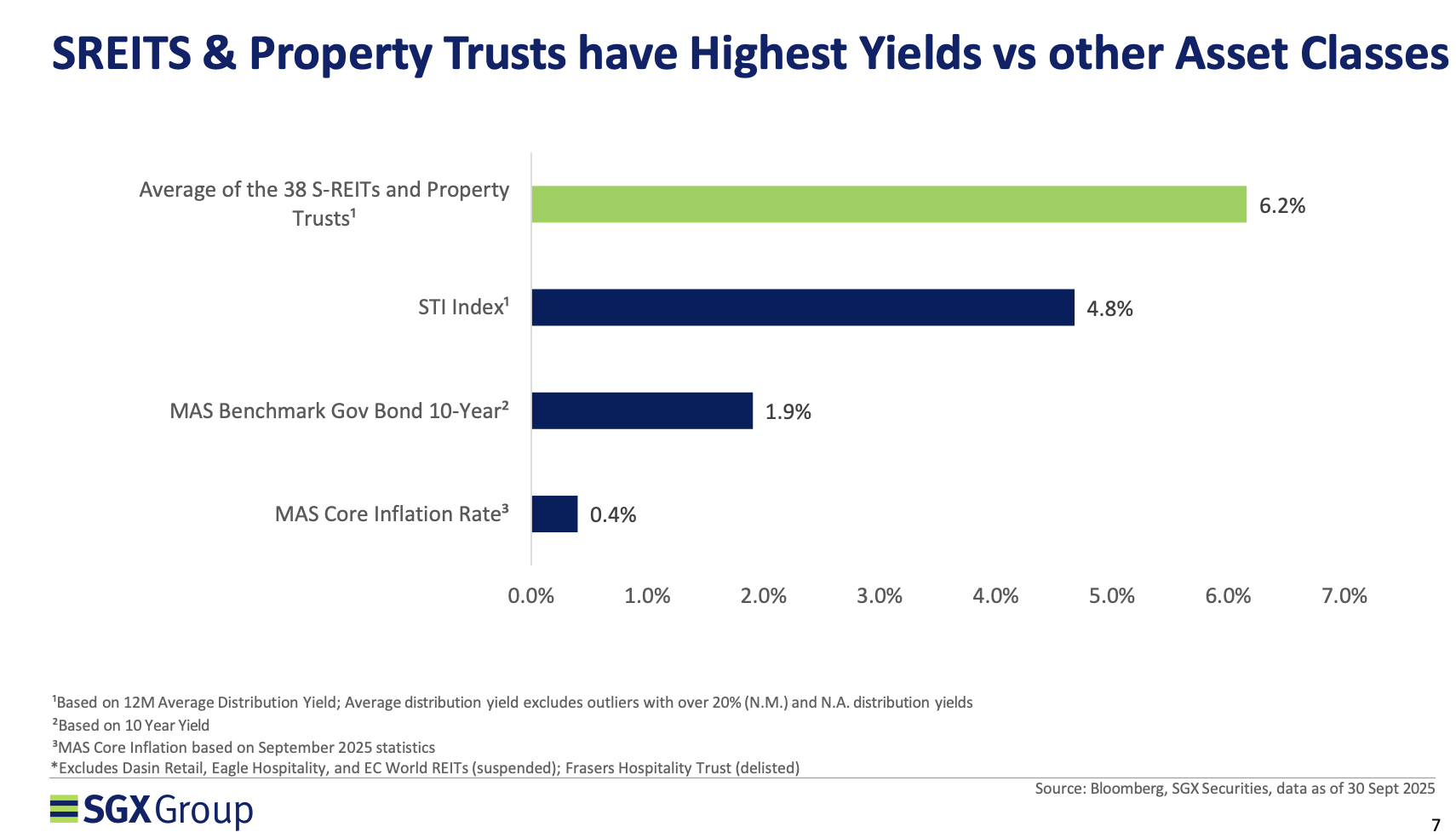 新华财经新加坡10月29日电(记者刘春涛)新加坡交易所(SGX Group)28日发布的《2025年第三季度SREITs及房地产信托图表》报告显示,新加坡REITs (房地产投资信托基金)及房地产信托市场保持稳健发展。 从财务健康状况来看,报告指出SREITs的平均杠杆率(average gearing ratio)为40%,低于50%的监管上限,显示出市场整体财务状况稳健。 新加坡REITs市场在资产配置上也展现了高度的国际化和多元化。报告显示,超过85%(即35只)的信托持有海外资产。从资产类别来看,多元化REITs占比 最大(26%),其次是工业REITs(18%)和零售REITs(16%)。 新加坡REITs(房地产投资信托基金)及房地产信托市场收益情况对比。图片来源:新交所 报告数据显示,截至2025年9月30日,新加坡共有41只REITs和房地产信托,总市值达到1010亿新元,约占新加坡整体上市股票市值的10%。 在收益率方面,报告显示SREITs的12个月的平均派息收益率(Average distribution yield)为6.2%。报告强调,与其他资产类别相比,SREITs提供了具有吸引 ...