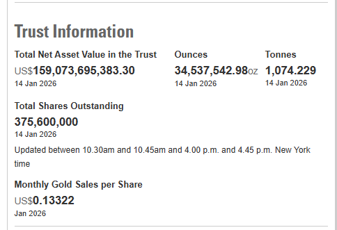 Group 1 - The SPDR Gold Trust, the world's largest gold ETF, reported a gold holding of 1,074.23 tonnes as of January 14, remaining unchanged from the previous trading day [1] - The total net asset value of the SPDR Gold Trust is approximately US$159.07 billion, equivalent to 34,537,542.98 ounces of gold [2] - The total shares outstanding for the SPDR Gold Trust is 375,600,000 [2]