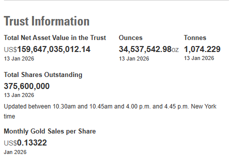截至1月13日 全球最大的黄金ETF——SPDR Gold Trust的黄金持仓量为1074.23吨 较上一交易日增加3.43吨