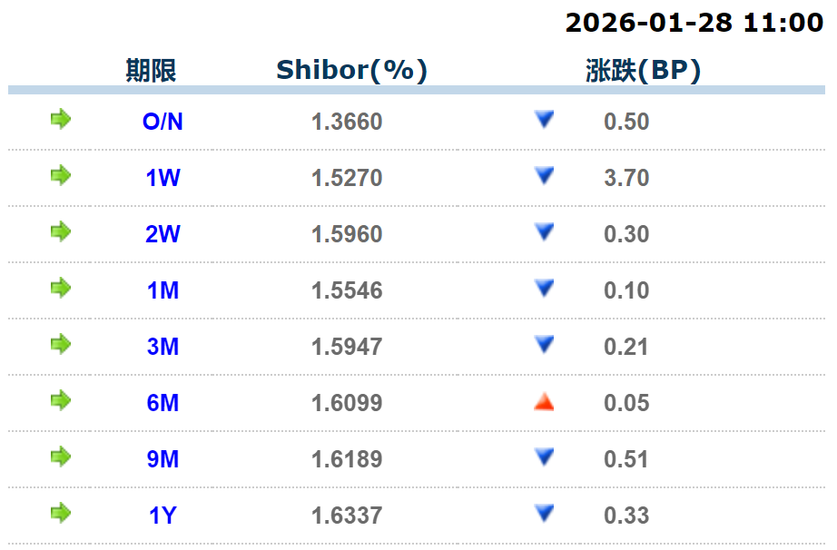 新华财经北京1月28日电人民银行28日开展3775亿元7天期逆回购操作,操作利率1.40%,与前次持平;鉴于当日有3635亿元逆回购到期,公开市场 实现净投放140亿元。 上海银行间同业拆放利率(Shibor)短期品种全线走低。具体来看,隔夜Shibor下跌0.50BP,报1.3660%;7天Shibor下跌3.70BP,报1.5270%;14天 Shibor下跌0.30BP,报1.5960%。 上海银行间同业拆放利率(1月28日) | | 期限 | Shibor(%) | 涨跌(BP) | | --- | --- | --- | --- | | 1 | O/N | 1.3660 | 0.50 | | 中 | 1W | 1.5270 | 3.70 | | 1 | 2W | 1.5960 | 0.30 | | → | 1 M | 1.5546 | 0.10 | | ゃ | 3M | 1.5947 | 0.21 | | 1 | 6M | 1.6099 | 0.05 | | 1 | 9M | 1.6189 | 0.51 | | | 1Y | 1.6337 | 0.33 | 来源:全国银行间同业拆借中心 银行间质押式 ...