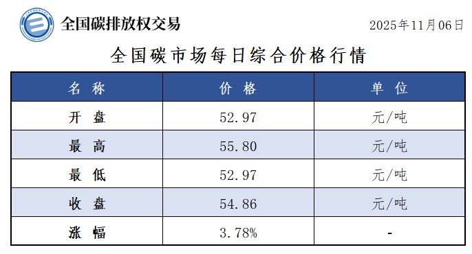 11月6日全国碳市场收盘价54.86元/吨 较前一日上涨3.78%