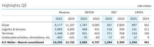 马士基首席执行官Vincent Clerc表示:"我们在第三季度各项业务中都交出了强劲的业绩。随着市场状况 的波动,我们有能力帮助客户适应并保持其供应链的稳定。" 在全年展望方面,马士基表示,预计红海地区的干扰影响将持续全年。现预计全年EBITDA将在90亿至 95亿美元之间,较之前的预期范围(80亿至95亿美元)上调。 (文章来源:新华财经) 新华财经北京11月6日电航运集团马士基(Maersk)周四(11月6日)报告称,在运营改善和积极成本措 施的推动下,公司2025年第三季度财务业绩强劲,在所有业务领域都实现了连续增长。在此基础上,马 士基完善了2025年全年的财务指导。 马士基表示,第三季度的息税折旧摊销前利润(EBITDA)同比下降44%,降至26.9亿美元,主要由于 运费下跌,但在一定程度上被海运的强劲交付量,及物流和服务以及码头业绩的改善所抵消。超过了公 司此前收集的分析师调查预期的25.8亿美元。 | Highlights Q3 | | | | | | | | USD million | | --- | --- | --- | --- | --- | --- | --- | --- | --- ...