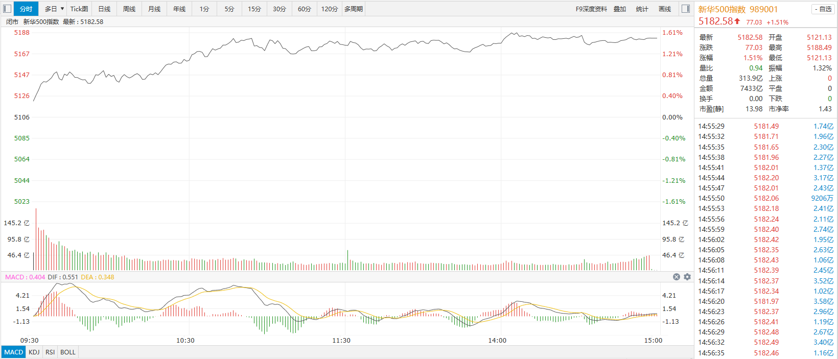 走势上看,新华500指数(989001)6日早间小有高开,随后震荡上行,午后指数持续高位整理,最终大幅收涨。指数盘中最高触及5182.58点,最低触及 5121.13点,成分股全天总成交额报7433亿元,成交额较上一交易日有所增加。 成分股方面,中国铝业、潍柴动力、东山精密、正泰电器等成分股涨幅居前;芒果超媒、贝泰妮、闻泰科技、乐普医疗等成分股跌幅靠前。 (文章来源:新华财经) 新华财经北京11月6日电 新华500指数(989001)11月6日收盘涨1.51%,报5182.58点。 ...