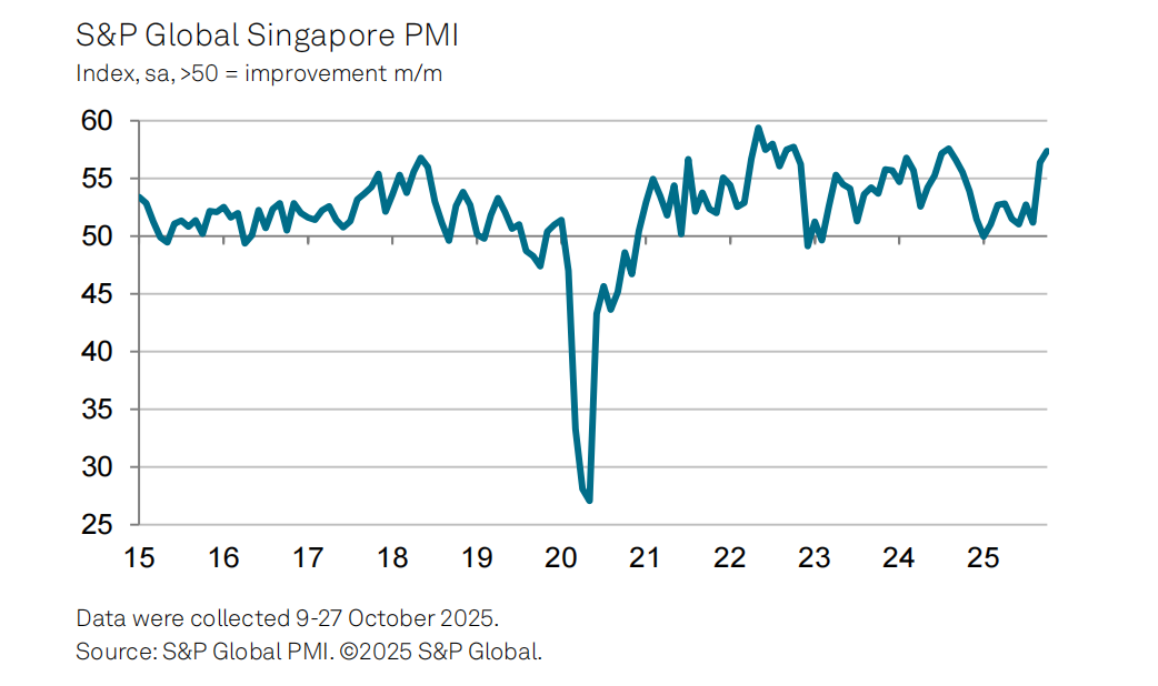 新华财经新加坡11月6日电(记者刘春涛)标普全球(S&P Global)5日发布的最新数据显示,受新订单和商业活动大幅扩张的推动,新加坡私营部 门的营商环境在2025年第四季度初进一步改善。10月采购经理指数(PMI)创下14个月新高,商业信心也攀升至四年多以来的最高水平。 不过,华侨银行也提到,近期人工智能(AI)相关的资本支出和云基础设施需求持续强劲。因此,林秀心总结道:"电子业的增长势头可能比整体制 造业的前景更为持久。" 在价格方面,标普全球的报告显示,尽管私营部门需求强劲,但通胀压力在10月有所缓解。由于采购价格和工资成本增速放缓,投入成本和产出价 格的通胀率均有所放缓。 标普全球市场财智经济副总监潘婧怡(Jingyi Pan)评论称:"最新的PMI数据显示新加坡私营部门在2025年第四季度初继续扩张。需求状况保持强 劲,刺激了就业和库存增长。"她指出,尽管需求改善,但通胀压力有所减弱,这对未来几个月的销售增长是个好兆头。 数据显示,经季节性调整的标普全球新加坡PMI从9月的56.4升至10月的57.4。该读数连续第九个月高于50.0的荣枯线,并标志着自2024年8月以来的 最快增长率。 报告指出, ...