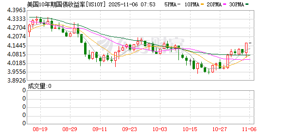 隔夜美债收益率全线上扬,主要受到经济数据表现强劲的推动。当地时间11月5日,美债收益率集体上 涨,2年期美债收益率涨5.99BPs报3.630%,3年期美债收益率涨6.52BPs报3.646%,5年期美债收益率涨 7.30BPs报3.764%,10年期美债收益率涨7.78BPs报4.159%,30年期美债收益率涨7.31BPs报4.737%。 最新非农就业数据显示,美国6月非农就业人数增加20.6万人,超过经济学家预期的19万人。同时失业 率保持在4.1%不变,平均时薪同比增长3.9%,高于预期的3.8%。业内人士表示,这些数据表明美国经 济依然保持较强韧性,降低了美联储大幅降息的可能性。 (文章来源:新华财经) 美联储政策路径也不明朗,鲍威尔曾强调"12月降息非定局",若美联储放缓降息步伐,美债收益率可能 进一步反弹。 不过,美联储理事斯蒂芬·米兰表示,ADP数据是一个"受欢迎的惊喜",并指出当前美联储政策"过于限 制性",认为"如果没有任何新信息,12月降息是合理的"。 这一相对鸽派的表态与其他美联储官员的谨慎立场形成对比。市场目前预计美联储在9月降息25个基点 的可能性为85%。 尽管经济数据强劲,但通 ...