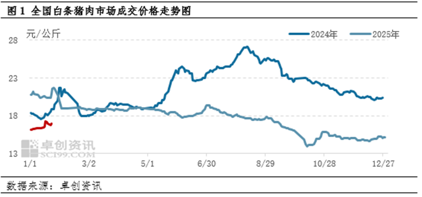 由于母猪产能去化,生猪及猪肉供应减少,2025年四季度以来白条猪肉价格震荡走高,且一直持续至2026年1月份。展望2 月份猪肉市场,基本面供需双减的背景下,2月份白条猪肉价格或先涨后跌,均价环比上涨。 2025年白条猪肉价格在10月份触及低点后开启反弹,虽然11月呈现缓跌状态,但12月中下旬猪肉价格强势走高,反弹走势 延续至2026年1月份。根据卓创资讯数据监测,截止到2026年1月26日,1月全国白条猪肉市场月度平均成交价为16.56元/ 公斤,较2025年12月份上涨。 展望2月份,预计白条猪肉价格或先涨后跌,均价或环比上涨 从供应端来看,2025年4月份能繁母猪存栏量仍处于下降走势,因此2月份出栏量或减少,且大猪需求或继续增加,带动部 分养殖场压栏增重心态,或减少部分供应增幅。 分析来看,猪肉价格走高的主要是因为能繁母猪存栏量下降后,供应端兑现出栏量缩减叠加养殖端压栏增重,且同期需求 出现提升。 具体来看,从农业农村部监测能繁母猪数量可以看出,从2025年3月能繁母猪存栏量下降,且下降幅度较大,由4066万头降 至4039万头。根据生猪生长周期推算,2026年1月份生猪出栏量是2025年3月能繁母猪存栏 ...