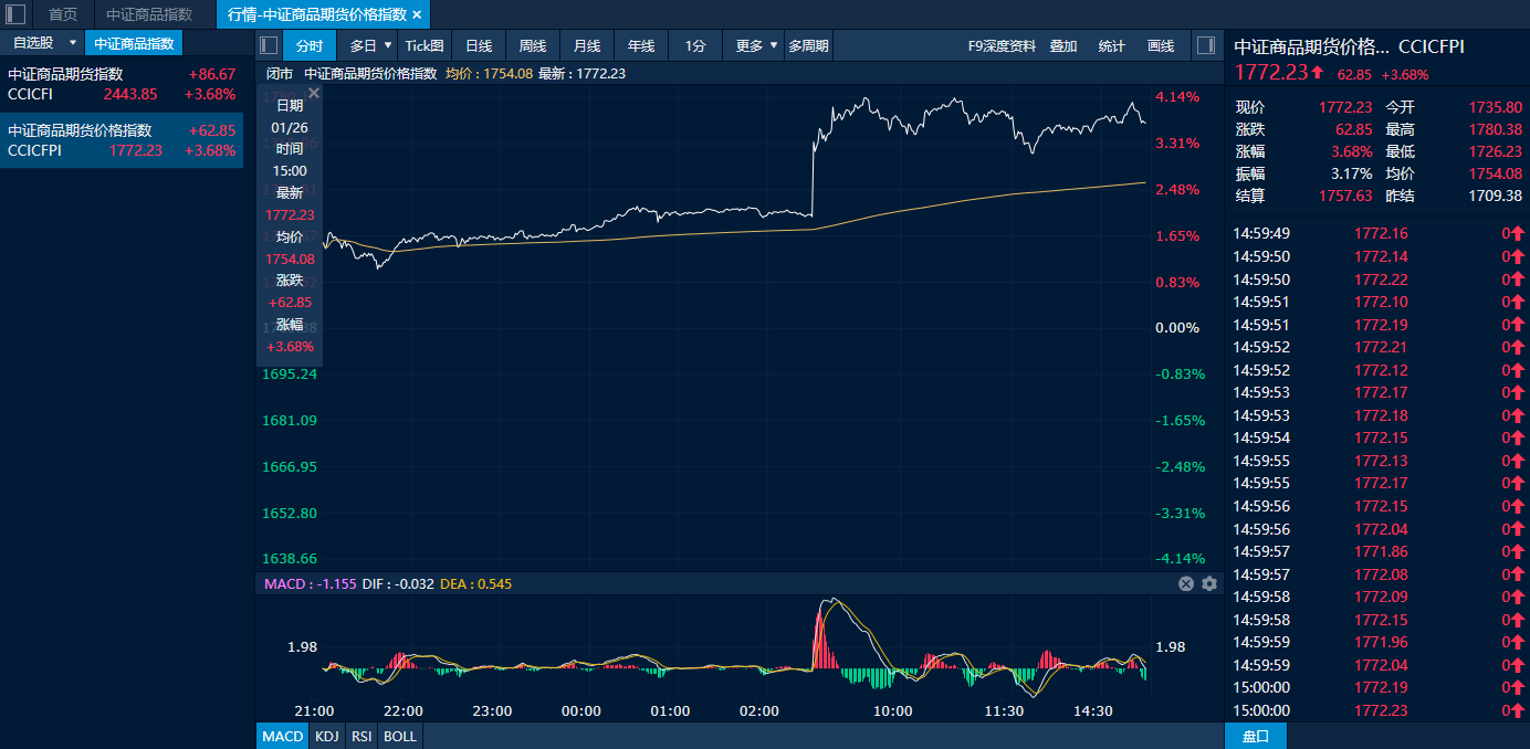 截至26日下午收盘,中证商品期货价格指数收报1772.23点,较前一交易日上涨62.85点,涨幅3.68%;中证商品期货指数收报2443.85点,较前一交易日上涨 86.67点,涨幅3.68%。 贵金属继续飙升双轮驱动油气强势走高 1月26日商品市场的热点仍在持续火热的贵金属市场以及近期快速反弹的能化板块。截至收盘,除沪银飙升近13%领涨商品市场以外,铂、钯分别跟涨超 9%、8%,金价涨幅虽不足4%,但仍历史性首次触及1150元/克上方。近期除了地缘局势继续给贵金属带来避险买盘以外,美国总统特朗普周末对加拿大的 关税威胁,进一步强化了市场"卖出美国"的交易倾向,加上美日联手干预日元贬值令美元兑日元汇率单日大跌,也加剧了美元的跌势。此外,市场对美联储 潜在新任主席人选的鸽派政策倾向或加速美联储宽松的押注,亦构成了强化贵金属看涨热情的重要利多。因此,环顾整个市场,对于贵金属而言,除了过于 一致的看涨预期可能成为潜在风险以外,市场暂时没有看到真正构成遏制贵金属多头热情的实际因素。在此背景下,即便机构多将短线获利回吐视为贵金属 价格波动的诱因,但仍维持对贵金属多头配置的策略建议。 贵金属市场火热也带动资金开始向估值洼 ...
