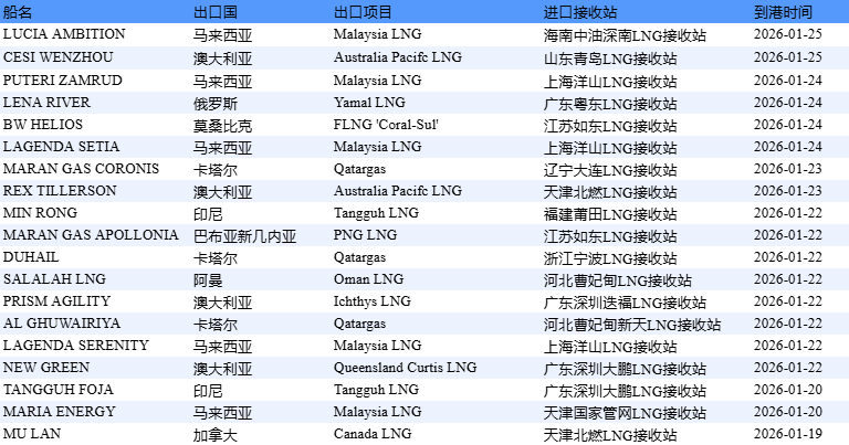 新华财经北京1月26日电中国天然气信息终端(E-Gas系统)发布的实时LNG进口到船数据显示,1月19日-1月25 日当周,预估中国通过沿海LNG接收站进口LNG共计19船,进口量约121万吨,前值为142万吨。 | 船名 | 田口田 | 出口项目 | 进口接收站 | 到港时间 | | --- | --- | --- | --- | --- | | LUCIA AMBITION | 吕来西亚 | Malaysia LNG | 海南中油深南LNG接收站 | 2026-01-25 | | CESI WENZHOU | 澳大利亚 | Australia Pacifc LNG | 山东青岛LNG接收站 | 2026-01-25 | | PUTERI ZAMRUD | 马来西亚 | Malaysia LNG | 上堂第3L NG共演出 | 2026-01-24 | | LENA RIVER | 俄罗斯 | Yamal LNG | 广东粤东LNG接收站 | 2026-01-24 | | BW HELIOS | 莫桑比克 | FLNG 'Coral-Sul' | 江苏如东LNG接收站 | 2026-01-24 | | LA ...
