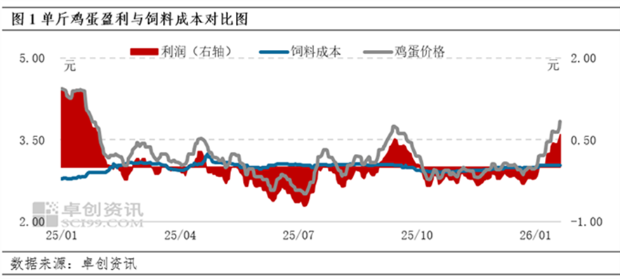 2026年1月蛋鸡养殖在此前三个月连续亏损之后实现扭亏为盈,究其原因,成本增加有限,而收入大幅增加是主因。展望2月,虽然蛋鸡 养殖成本趋稳,但鸡蛋价格或高位回落,这意味着蛋鸡养殖将再次面临亏损风险。 2月蛋鸡养殖或再次进入亏损局面 展望2月份鸡蛋市场,鸡蛋需求季节性转淡,但供应面压力仍在,鸡蛋价格或高位回落。 具体来看,需求方面,2月食品加工企业和学校陆续放假,市场需求逐渐转淡。 供应方面,根据前期鸡苗销量以及老母鸡出栏量数据进行推算,1月新开产蛋鸡供应量或有所减少,但养殖户惜售情绪影响下,老母鸡淘 汰量不大,或支撑在产蛋鸡存栏量高位微降,鸡蛋供应仍较充足。综合研判,预计2月鸡蛋市场供强需弱,蛋价或高位回落,预计均价下 滑0.90-1.00元/斤,蛋价跌至低位。 1月蛋鸡养殖扭亏为盈 2026年1月蛋鸡养殖终于扭亏为盈。卓创资讯监测显示,1月1日至23日,蛋鸡养殖由亏损0.22元转为盈利0.61元,累计增加0.83元,成功扭 转3个月的亏损局面。1月鸡蛋价格和饲料价格齐涨,但鸡蛋价格涨幅较大,支撑蛋鸡养殖盈利扭亏为盈。 具体来看,供应压力下滑,季节性需求显著提升,1月蛋价强势上涨。由于2025年12月全国在产 ...