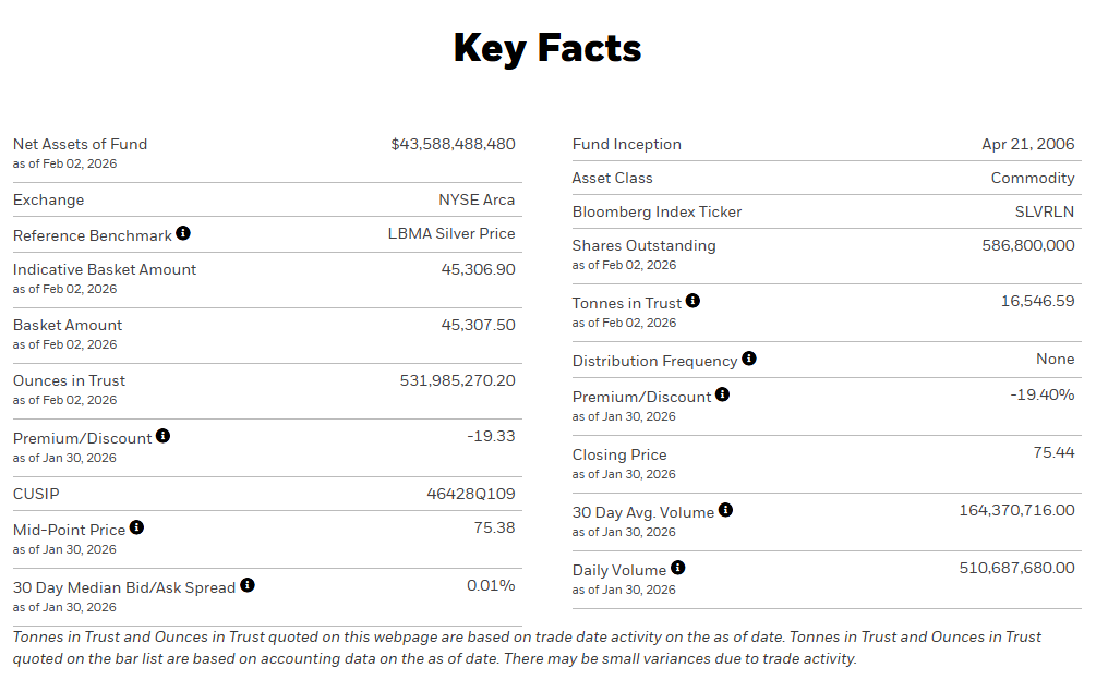 截至2月2日,全球最大白银ETF——iShares Silver Trust的白银持仓量为16,546.59吨,较前一交易日增加1023.23吨。 资讯编辑:王芳琴 021-66896877 资讯监督:乐卫扬 021-26093827 资讯投诉:陈跃进 021-26093100 免责声明:Mysteel发布的原创及转载内容,仅供客户参考,不作为决策建议。原创内容版权归Mysteel所有,转载需取得Mysteel书面授权,且Mysteel保留对任何侵权行为和有悖原创内容原意的 引用行为进行追究的权利。转载内容来源于网络,目的在于传递更多信息,方便学习与交流,并不代表Mysteel赞同其观点及对其真实性、完整性负责。 | Net Assets of Fund | $43,588,488,480 | Fund Inception | | --- | --- | --- | | as of Feb 02, 2026 | | | | | | Asset Class | | Exchange | NYSE Arca | | | | | Bloomberg Index Ticker | | Reference Benchm ...