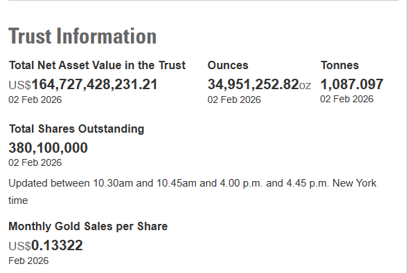 资讯编辑:王芳琴 021-66896877 资讯监督:乐卫扬 021-26093827 资讯投诉:陈跃进 021-26093100 截至2月2日,全球最大的黄金ETF——SPDR Gold Trust的黄金持仓量为1,087.10吨,与前一交易日持 平。 免责声明:Mysteel发布的原创及转载内容,仅供客户参考,不作为决策建议。原创内容版权归Mysteel所有,转载需取得Mysteel书面授 权,且Mysteel保留对任何侵权行为和有悖原创内容原意的引用行为进行追究的权利。转载内容来源于网络,目的在于传递更多信息,方 便学习与交流,并不代表Mysteel赞同其观点及对其真实性、完整性负责。 ...