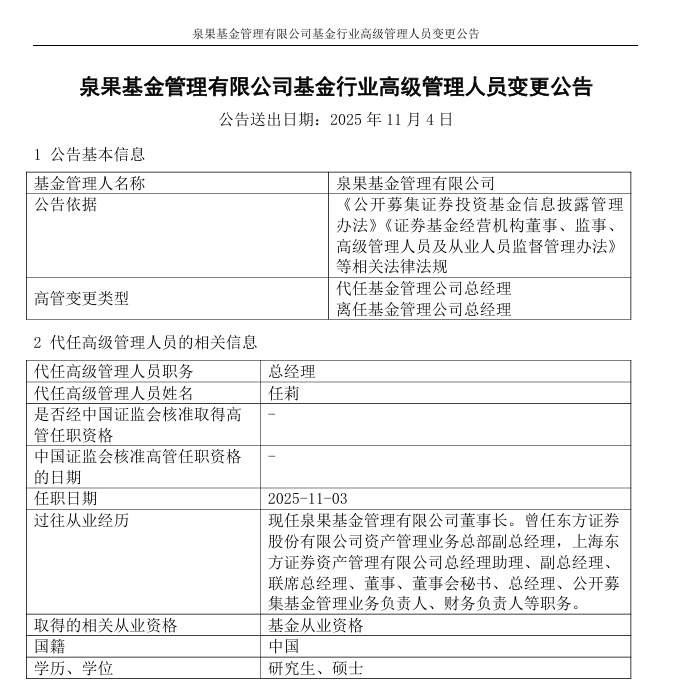 | 基金管理人名称 | 泉果基金管理有限公司 | | --- | --- | | 公告依据 | 《公开募集证券投资基金信息披露管理 | | | 办法》《证券基金经营机构董事、监事、 | | | 高级管理人员及从业人员监督管理办法》 | | | 等相关法律法规 | | 高管变更类型 | 代任基金管理公司总经理 | | | 离任基金管理公司总经理 | 新华财经上海11月3日电 11月3日,泉果基金官网发布高级管理人员变更公告,公告显示公司创始人、 总经理王国斌病逝,即日起由董事长任莉代任总经理职务。目前,泉果基金官网已切换为黑白色调,以 表达对王国斌的深切哀悼。 公开信息显示,王国斌拥有北京大学硕士学位、中欧国际工商学院EMBA学历,累计证券从业经验达31 年。他曾参与创办君和资本,并作为东方红资产管理的创始人,为资本市场投资老将。 | 代任高级管理人员职务 | 总经理 | | --- | --- | | 代任高级管理人员姓名 | 任莉 | | 是否经中国证监会核准取得高 | | | 管任职资格 | | | 中国证监会核准高管任职资格 | | | 的目期 | | | 任职日期 | 2025-11-03 | | 过 ...