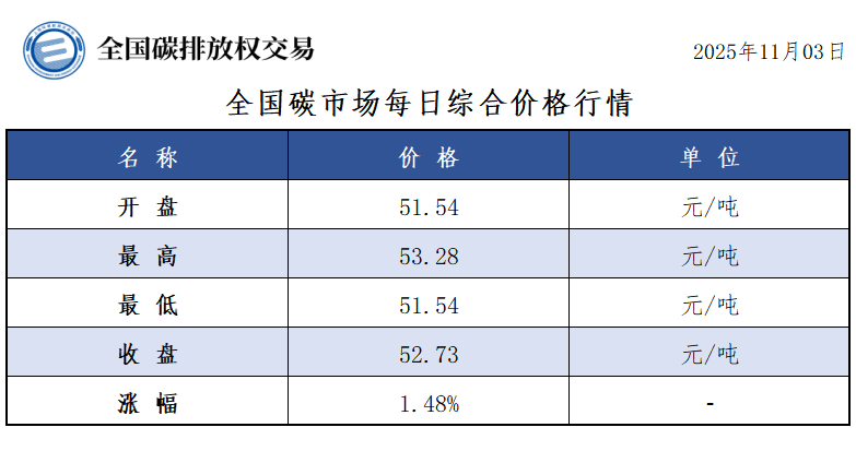 今日挂牌协议交易成交量421,568吨,成交额20,448,225.30元;大宗协议交易成交量1,105,615吨,成交额55,169,669.00元;今日无单向竞价。 今日全国碳排放配额总成交量1,527,183吨,总成交额75,617,894.30元。 2025年1月1日至11月3日,全国碳市场碳排放配额成交量141,188,515吨,成交额8,861,414,482.11元。 截至2025年11月3日,全国碳市场碳排放配额累计成交量771,457,179吨,累计成交额51,894,141,585.62元。 新华财经北京11月3日电据微信公众号"全国碳交易",11月3日全国碳市场综合价格行情为开盘价51.54元/吨,最高价53.28元/吨,最低价51.54元/吨, 收盘价52.73元/吨,收盘价较前一日上涨1.48%。 | 名 称 | 价 格 | 单 位 | | --- | --- | --- | | 开 盘 | 51. 54 | 元/吨 | | 最 高 | 53. 28 | 元/吨 | | 最 低 | 51. 54 | 元/吨 | | 收 盘 | 52. 73 | 元/吨 | | 涨幅 | 1. 48% ...