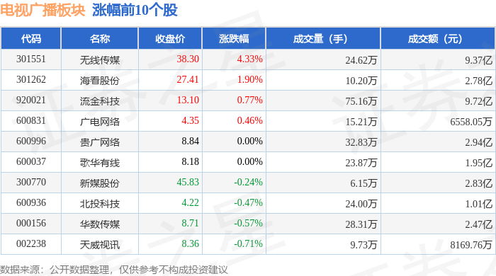 证券之星消息,1月30日电视广播板块较上一交易日下跌1.51%,吉视传媒领跌。当日上证指数报收于 4117.95,下跌0.96%。深证成指报收于14205.89,下跌0.66%。电视广播板块个股涨跌见下表: | 代码 | 名称 | 主力净流入(元) | 主力净占比 游资净流入(元) | | 游资净占比 散户净流入(元) | | 散户净占比 | | --- | --- | --- | --- | --- | --- | --- | --- | | 301551 无线传媒 | | 4426.13万 | 4.72% | 706.57万 | 0.75% | -5132.70万 | -5.48% | | 301262 海看股份 | | 2083.48万 | 7.50% | 852.01万 | 3.07% | -2935.49万 | -10.57% | | 600996 盖广网络 | | 856.62万 | 2.91% | 538.40万 | 1.83% | -1395.02万 | -4.74% | | 600831 广电网络 | | 702.41万 | 10.71% | -271.05万 | -4.13% | -431 ...