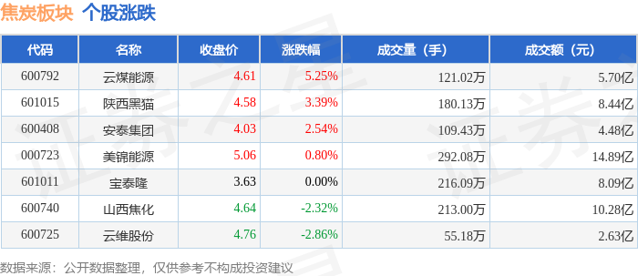证券之星消息,1月30日焦炭板块较上一交易日上涨0.59%,云煤能源领涨。当日上证指数报收于 4117.95,下跌0.96%。深证成指报收于14205.89,下跌0.66%。焦炭板块个股涨跌见下表: | 代码 | 名称 | 主力净流入(元) | 主力净占比 游资净流入 (元) | | 游资净占比 散户净流入 (元) | | 散户净占比 | | --- | --- | --- | --- | --- | --- | --- | --- | | 000723 美锦能源 | | 1.26亿 | 8.48% | -1361.22万 | -0.91% | -1.13 Z | -7.56% | | 600792 云煤能源 | | 1.00 Z | 17.62% | -3374.20万 | -5.92% | -6667.88万 | -11.70% | | 601015 陕西黑猫 | | 7028.35万 | 8.33% | -4749.00万 | -5.63% | -2279.35万 | -2.70% | | 601011 | 宝泰隆 | 4079.47万 | 5.04% | -1230.79万 | -1.52% | -2 ...