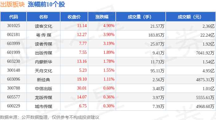 | 代码 | 名称 | 收盘价 | 涨跌幅 | 成交量(手) | 成交额(元) | | --- | --- | --- | --- | --- | --- | | 300364 | 中文在线 | 31.78 | -3.46% | 72.29万 | 23.18亿 | | 301231 | 荣信文化 | 40.80 | -3.16% | 7.62万 | 3.12亿 | | 300654 | 世纪天鸿 | 12.37 | -2.68% | 39.36万 | 4.87亿 | | 301052 | 果麦文化 | 39.73 | -1.90% | 5.77万 | 2.30亿 | | 601900 | 南方传媒 | 15.10 | -1.82% | 16.82万 | 2.55亿 | | 600373 | 中文传媒 | 9.39 | -1.68% | 17.97万 | 1.69亿 | | 600825 | 新华传媒 | 6.92 | -1.56% | 21.11万 | 1.47 Z | | 601811 | 新华文轩 | 15.57 | -1.46% | 5.91万 | 9293.12万 | | 601801 | 皖新传媒 ...