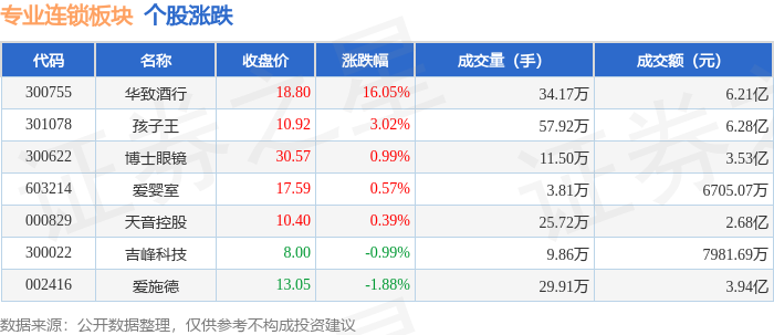 证券之星消息,1月29日专业连锁板块较上一交易日上涨2.14%,华致酒行领涨。当日上证指数报收于 4157.98,上涨0.16%。深证成指报收于14300.08,下跌0.3%。专业连锁板块个股涨跌见下表: | 代码 | 名称 | 收盘价 | 涨跌幅 | 成交量(手) | 成交额(元) | | --- | --- | --- | --- | --- | --- | | 300755 | 华致酒行 | 18.80 | 16.05% | 34.17万 | 6.21 亿 | | 301078 | 孩子王 | 10.92 | 3.02% | 57.92万 | 6.28亿 | | 300622 | 博士眼鏡 | 30.57 | 0.99% | 11.50万 | 3.53亿 | | 603214 | 爱婴室 | 17.59 | 0.57% | - 3.81万 | 6705.07万 | | 000829 | 天音控股 | 10.40 | 0.39% | 25.72万 | 2.68亿 | | 300022 | 吉峰科技 | 8.00 | -0.99% | 9.86万 | 7981.69万 | | 002416 | 爰施德 | ...