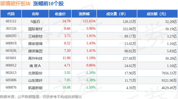 | 代码 | 名称 | 收盘价 | 涨跌幅 | 成交量(手) | 成交额(元) | | --- | --- | --- | --- | --- | --- | | 601112 | N振石 | 24.78 | 121.65% | 120.23万 | 32.20 乙 | | 301526 | 国际复材 | 8.66 | 3.96% | 332.08万 | 30.19亿 | | 600293 | 三峡新材 | 3.73 | 1.91% | 89.17万 | 3.27亿 | | 618009 | 耀皮玻璃 | 8.52 | 1.43% | 13.65万 | 1.16亿 | | 601636 | 旗滨集团 | 7.20 | 1.41% | 80.82万 | 5.83亿 | | 603601 | 再升科技 | 11.90 | 1.10% | 257.68万 | 30.28亿 | | 000012 | 南 玻 A | 4.71 | 0.86% | 24.62万 | 1.16亿 | | 002613 | 北玻股份 | 3.92 | -1.26% | 17.90万 | 7056.33万 | | 605006 | 山东玻纤 | ...