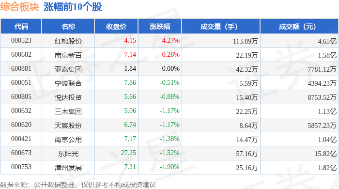 | 代码 | 名称 | 收盘价 | 涨跌幅 | 成交量(手) | 成交额(元) | | --- | --- | --- | --- | --- | --- | | 000833 | 粤桂股份 | 21.22 | -5.44% | 45.10万 | 9.83 6 | | 000025 | 特 | 18.74 | -3.90% | 23.85万 | 4.57 Z | | 600689 | 上海三毛 | 13.26 | -3.70% | 4.32万 | 5822.60万 | | 000652 | 泰达股份 | 4.48 | -2.61% | 47.36万 | 2.13亿 | | 600770 | 综艺股份 | 6.66 | -2.06% | 106.72万 | 7.17亿 | | 000753 | 漳州发展 | 7.21 | -1.90% | 25.16万 | 1.82亿 | | 600673 | 东阳光 | 27.25 | -1.52% | 57.16万 | 15.82亿 | | 000421 | 南京公用 | 7.17 | -1.38% | 14.47万 | 1.04亿 | | 600620 | 天宸股份 | ...