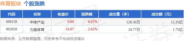 证券之星消息,1月29日体育板块较上一交易日上涨5.81%,中体产业领涨。当日上证指数报收于 4157.98,上涨0.16%。深证成指报收于14300.08,下跌0.3%。体育板块个股涨跌见下表: | 代码 | 名称 | 收盘价 | 涨跌幅 | 成交量(手) | | 成交额(元) | | | --- | --- | --- | --- | --- | --- | --- | --- | | 600158 | 中体产业 | 9.60 | 6.67% | | 128.36万 | | 12.35 乙 | | 002858 | 力盛体育 | 16.07 | 2.62% | | 10.77万 | | 1.75亿 | 以上内容为证券之星据公开信息整理,由AI算法生成(网信算备310104345710301240019号),不构成投资建议。 从资金流向上来看,当日体育板块主力资金净流入1.39亿元,游资资金净流出9716.86万元,散户资金净 流出4175.7万元。体育板块个股资金流向见下表: | | | | 代码 名称 主力净流入 (元) 主力净占比 游资净流入 (元) 游资净占比 散户净占比 | | | | | --- ...