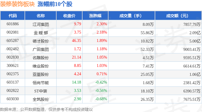 证券之星消息,1月29日装修装饰板块较上一交易日下跌0.99%,ST柯利达领跌。当日上证指数报收于 4157.98,上涨0.16%。深证成指报收于14300.08,下跌0.3%。装修装饰板块个股涨跌见下表: | 代码 | 名称 | 收盘价 | 涨跌幅 | 成交量(手) | 成交额(元) | | | --- | --- | --- | --- | --- | --- | --- | | 601886 | 江河集团 | 9.79 | 2.30% | 8.09万 | | 7857.79万 | | 002081 | 金壁部 | 3.75 | 2.18% | 55.86万 | | 2.09亿 | | 605287 | 德才股份 | 46.35 | 1.89% | 10.82万 | | 5.00亿 | | 002482 | 广田集团 | 1.72 | 1.18% | 52.33万 | | 9003.41万 | | 002830 | 名雕股份 | 21.14 | 1.05% | 4.51万 | | 9595.51万 | | 300621 | 维业股份 | 8.85 | 1.03% | 7.41万 | | 6614.61万 ...