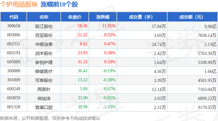 证券之星消息,1月29日个护用品板块较上一交易日上涨0.49%,延江股份领涨。当日上证指数报收于 4157.98,上涨0.16%。深证成指报收于14300.08,下跌0.3%。个护用品板块个股涨跌见下表: | 代码 | 名称 | 收盘价 | 涨跌幅 | 成交量(手) | 成交额(元) | | | --- | --- | --- | --- | --- | --- | --- | | 001206 | 依依股份 | 25.19 | -2.06% | 4.06万 | | 1.03亿 | | 301108 | 洁雅股份 | 33.83 | -1.71% | 1.13万 | 3856.97万 | | | 001328 | 登康口腔 | 39.98 | -1.33% | 2.31万 | 9179.55万 | | | 603059 | 倍加洁 | 33.90 | -0.82% | 2.03万 | 6899.22万 | | | 600249 | 两面针 | 5.89 | -0.67% | 12.14万 | 7163.04万 | | | 301009 | 可靠股份 | 13.22 | -0.38% | 3.39万 | 450 ...