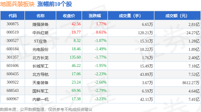 证券之星消息,1月28日地面兵装板块较上一交易日下跌1.89%,银河电子领跌。当日上证指数报收于 4151.24,上涨0.27%。深证成指报收于14342.9,上涨0.09%。地面兵装板块个股涨跌见下表: | 代码 | 名称 | 收盘价 | 涨跌幅 | 成交量(手) | 成交额(元) | | | --- | --- | --- | --- | --- | --- | --- | | 300875 | 捷强装备 | 42.56 | 1.77% | 6.65万 | | 2.81亿 | | 000519 | 中兵红箭 | 19.77 | 0.61% | 120.21万 | | 24.27亿 | | 300527 | ST应急 | 8.32 | -1.07% | 15.31万 | | 1.28亿 | | 600184 | 光电股份 | 18.46 | -1.49% | 10.22万 | | 1.89亿 | | 301357 | 北方长龙 | 135.60 | -1.77% | 1.76万 | | 2.40亿 | | 601606 | 长城军工 | 46.22 | -1.95% | 15.49万 | | 7.18亿 | ...