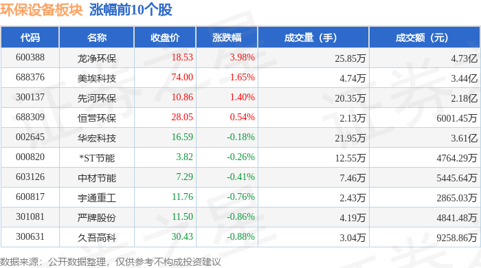 证券之星消息,1月28日环保设备板块较上一交易日下跌0.6%,青达环保领跌。当日上证指数报收于 4151.24,上涨0.27%。深证成指报收于14342.9,上涨0.09%。环保设备板块个股涨跌见下表: | 代码 | 名称 | 收盘价 | 涨跌幅 | 成交量(手) | 成交额(元) | | | --- | --- | --- | --- | --- | --- | --- | | 600388 | 龙净环保 | 18.53 | 3.98% | 25.85万 | | 4.73亿 | | 688376 | 美埃科技 | 74.00 | 1.65% | 4.74万 | | 3.44亿 | | 300137 | 先河环保 | 10.86 | 1.40% | 20.35万 | | 2.18亿 | | 6058889 | 恒营环保 | 28.05 | 0.54% | 2.13万 | | 6001.45万 | | 002645 | 华宏科技 | 16.59 | -0.18% | 21.95万 | | 3.61亿 | | 000820 | *ST节能 | 3.82 | -0.26% | 12.55万 | | 4764.29万 ...