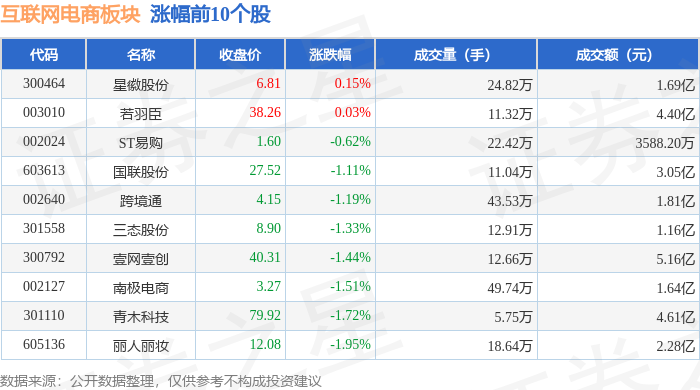 证券之星消息,1月28日互联网电商板块较上一交易日下跌1.55%,凯淳股份领跌。当日上证指数报收于 4151.24,上涨0.27%。深证成指报收于14342.9,上涨0.09%。互联网电商板块个股涨跌见下表: | 代码 | 名称 | 收盘价 | 涨跌幅 | 成交量(手) | 成交额(元) | | | --- | --- | --- | --- | --- | --- | --- | | 300464 | 星徽股份 | 6.81 | 0.15% | 24.82万 | | 1.69 Z | | 003010 | 若羽臣 | 38.26 | 0.03% | 11.32万 | | 4.40 Z | | 002024 | ST易购 | 1.60 | -0.62% | 22.42万 | | 3588.20万 | | 603613 | 国联股份 | 27.52 | -1.11% | 11.04万 | | 3.05亿 | | 002640 | 跨境通 | 4.15 | -1.19% | 43.53万 | | 1.81亿 | | 301558 | 三态股份 | 8.90 | -1.33% | 12.91万 | | 1.16亿 ...