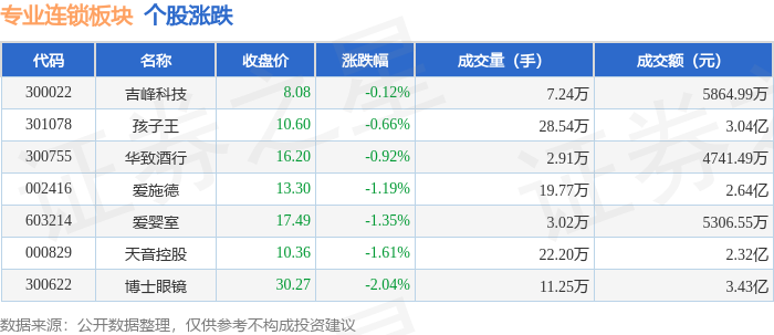 从资金流向上来看,当日专业连锁板块主力资金净流出1.07亿元,游资资金净流入4265.14万元,散户资 金净流入6468.91万元。专业连锁板块个股资金流向见下表: | 代码 | 名称 | 主力净流入 (元) | 主力净占比 游资净流入 (元) | | 游资净占比 散户净流入 (元) | | 散户净占比 | | --- | --- | --- | --- | --- | --- | --- | --- | | 300022 | 吉峰科技 | -31.05万 | -0.53% | 337.09万 | 5.75% | -306.04万 | -5.22% | | 301078 | 孩子王 | -187.27万 | -0.62% | -595.17万 | -1.96% | 782.44万 | 2.58% | | 300755 华致酒行 | | -290.22万 | -6.12% | 271.39万 | 5.72% | 18.82万 | 0.40% | | 603214 | 爱婴室 | -426.88万 | -8.04% | -94.10万 | -1.77% | 520.98万 | 9.82% | | 002416 | ...
