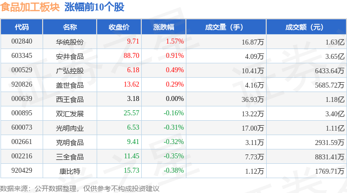 证券之星消息,1月28日食品加工板块较上一交易日下跌0.66%,交大昂立领跌。当日上证指数报收于 4151.24,上涨0.27%。深证成指报收于14342.9,上涨0.09%。食品加工板块个股涨跌见下表: | 代码 | 名称 | 收盘价 | 涨跌幅 | 成交量(手) | 成交额(元) | | | --- | --- | --- | --- | --- | --- | --- | | 002840 | 华统股份 | 9.71 | 1.57% | 16.87万 | | 1.63亿 | | 603345 | 安井食品 | 88.70 | 0.91% | 4.09万 | | 3.65亿 | | 000529 | 广弘控股 | 6.18 | 0.49% | 10.41万 | 6433.64万 | | | 920826 | 盖世食品 | 13.62 | 0.29% | - 4.16万 | 5685.72万 | | | 000639 | 西王食品 | 3.18 | 0.00% | 36.93万 | | 1.18亿 | | 000895 | 双汇发展 | 25.57 | -0.16% | 13.22万 | | 3.40亿 | ...
