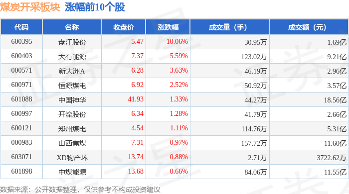 | 代码 | 名称 | 收盘价 | 涨跌幅 | 成交量(手) | 成交额(元) | | | --- | --- | --- | --- | --- | --- | --- | | 600395 | 盘江股份 | 5.47 | 10.06% | 30.95万 | | 2697 | | 600403 | 大有能源 | 7.37 | 5.59% | 123.02万 | | 9.21亿 | | 000571 | 新大洲A | 6.28 | 3.63% | 46.19万 | | 2.96亿 | | 600971 | 恒源煤电 | 6.92 | 2.52% | 50.92万 | | 3.57亿 | | 601088 | 中国神华 | 41.93 | 1.33% | 44.27万 | | 18.56亿 | | 600997 | 开滦股份 | 6.34 | 1.28% | 41.79万 | | 2.66亿 | | 600121 | 郑州煤电 | 4.54 | 1.11% | 114.76万 | | 5.31亿 | | 000983 | 山西焦煤 | 7.31 | 0.97% | 157.72万 | | 11.60亿 | | ...