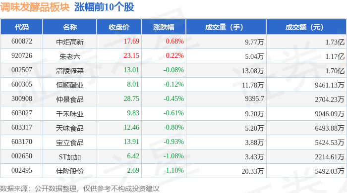 证券之星消息,1月28日调味发酵品板块较上一交易日下跌1.07%,日辰股份领跌。当日上证指数报收于 4151.24,上涨0.27%。深证成指报收于14342.9,上涨0.09%。调味发酵品板块个股涨跌见下表: 从资金流向上来看,当日调味发酵品板块主力资金净流出1.8亿元,游资资金净流入1.06亿元,散户资金 净流入7378.53万元。调味发酵品板块个股资金流向见下表: | 代码 | 名称 | 主力净流入(元) | 主力净占比 游资净流入 (元) | | 游资净占比 散户净流入(元) | | 散户净占比 | | --- | --- | --- | --- | --- | --- | --- | --- | | 600872 中炬高新 | | 1017.00万 | 5.88% | 1130.03万 | 6.54% | -2147.03万 | -12.42% | | 920726 | 朱老六 | 188.79万 | 1.61% | -196.44万 | -1.67% | -118.59万 | -1.01% | | 300908 | 伸물食品 | 144.37万 | 5.34% | -105.88万 | -3.92% ...