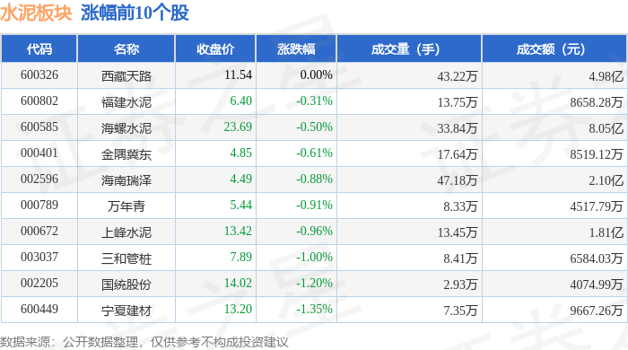 证券之星消息,1月27日水泥板块较上一交易日下跌1.21%,四方新材领跌。当日上证指数报收于 4139.9,上涨0.18%。深证成指报收于14329.91,上涨0.09%。水泥板块个股涨跌见下表: | 代码 | 名称 | 收盘价 | 涨跌幅 | 成交量(手) | 成交额(元) | | | --- | --- | --- | --- | --- | --- | --- | | 600326 | 西藏天路 | 11.54 | 0.00% | 43.22万 | | 4.98亿 | | 600802 | 福建水泥 | 6.40 | -0.31% | 13.75万 | | 8658.28万 | | 600585 | 海螺水泥 | 23.69 | -0.50% | 33.84万 | | 8.05亿 | | 000401 | 金隅莫东 | 4.85 | -0.61% | 17.64万 | 8519.12万 | | | 002596 | 烘脂屋使 | 4.49 | -0.88% | 47.18万 | | 2.10亿 | | 000789 | 万年青 | 5.44 | -0.91% | 8.33万 | | 4517.79万 | ...