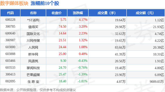 证券之星消息,1月30日数字媒体板块较上一交易日下跌0.05%,凡拓数创领跌。当日上证指数报收于 4117.95,下跌0.96%。深证成指报收于14205.89,下跌0.66%。数字媒体板块个股涨跌见下表: | 代码 | 名称 | 收盘价 | 涨跌幅 | 成交量(手) | 成交额(元) | | | --- | --- | --- | --- | --- | --- | --- | | 600228 | *ST返利 | 5.75 | 4.17% | 19.64万 | | 1.12亿 | | 300785 | 值得买 | 74.50 | 3.20% | 29.98万 | | 21.93亿 | | 600640 | 国脉文化 | 14.64 | 2.23% | 32.63万 | | 4.74亿 | | 300987 | 川网传媒 | 21.51 | 1.32% | 19.65万 | | 4.22亿 | | 603000 | 人民网 | 24.44 | 1.08% | 83.66万 | | 20.38亿 | | 603888 | 新华网 | 25.00 | 0.48% | 41.39万 | | 10.31亿 | | ...