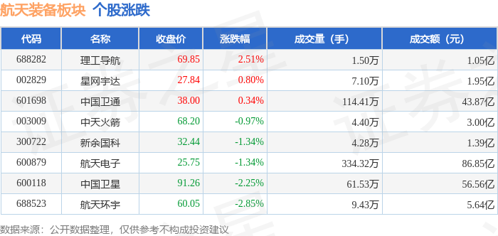 证券之星消息,1月30日航天装备板块较上一交易日下跌0.84%,航天环宇领跌。当日上证指数报收于 4117.95,下跌0.96%。深证成指报收于14205.89,下跌0.66%。航天装备板块个股涨跌见下表: | 代码 名称 | 主力净流入(元) | 主力净占比 游资净流入 (元) | | 游资净占比 散户净流入 (元) | | 散户净占比 | | --- | --- | --- | --- | --- | --- | --- | | 601698 中国卫通 | 1.08亿 | 2.46% | 1.11亿 | 2.54% | -2.19 Z | -5.00% | | 688282 理工导航 | 1193.52万 | 11.38% | -985.86万 | -9.40% | -207.66万 | -1.98% | | 003009 中天火箭 | -480.42万 | -1.60% | -2276.32万 | -7.58% | 2756.74万 | 9.18% | | 002829 星网宇达 | -912.02万 | -4.67% | -713.72万 | -3.66% | 1625.73万 | 8.33% | | ...