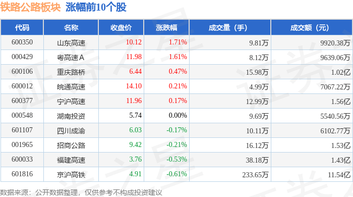 | 代码 | 名称 | 收盘价 | 涨跌幅 | 成交量(手) | 成交额(元) | | --- | --- | --- | --- | --- | --- | | 001317 | 三丰司 | 48.20 | -2.55% | 5.84万 | 2.77亿 | | 600650 | 锦江在线 | 15.86 | -2.22% | 11.86万 | 1.88亿 | | 600611 | 大众交通 | 5.74 | -2.05% | 31.33万 | 1.80亿 | | 600561 | 江西长运 | 6.86 | -1.86% | 4.67万 | 3188.39万 | | 600834 | 申通地铁 | 8.94 | -1.54% | 4.20万 | 3738.29万 | | 000557 | 西部创业 | 5.00 | -1.38% | 13.70万 | 6873.70万 | | 601518 | 吉林高速 | 2.86 | -1.38% | 15.01万 | 4315.96万 | | 600125 | 铁龙物流 | 6.49 | -1.37% | 15.49万 | 1.01亿 | | 000828 | 东莞控 ...