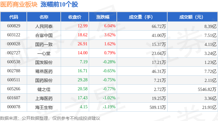 证券之星消息,1月27日医药商业板块较上一交易日下跌1.77%,漱玉平民领跌。当日上证指数报收于 4139.9,上涨0.18%。深证成指报收于14329.91,上涨0.09%。医药商业板块个股涨跌见下表: | 代码 | 名称 | 收盘价 | 涨跌幅 | 成交量(手) | 成交额(元) | | --- | --- | --- | --- | --- | --- | | 600829 | 人民同泰 | 12.99 | 6.04% | 66.72万 | 8.39亿 | | 603122 | 合富中国 | 18.62 | 3.62% | 41.00万 | 7.51亿 | | 000028 | 国药一致 | 26.91 | 1.62% | 15.37万 | 4.11亿 | | 002727 | 一心堂 > | 14.00 | 0.79% | 1 23.04万 | 3.24亿 | | 600538 | 国发股份 | 7.19 | -0.28% | 17.21万 | 1.23亿 | | 002788 | 鹭苑医药 | 16.71 | -0.65% | 46.31万 | 7.72亿 | | 600511 | 国药股份 | 2 ...