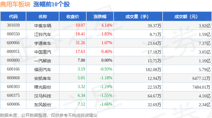 | 代码 | 名称 | 收盘价 | 涨跌幅 | 成交量(手) | 成交额(元) | | --- | --- | --- | --- | --- | --- | | 600686 | 金成汽车 | 19.06 | -10.01% | 19.77万 | 3.86 Z | | 600418 | 江淮汽车 | 50.60 | -2.62% | 54.35万 | 27.49亿 | | 000957 | 中通客车 | 11.64 | -1.69% | C 17.77万 | 2.07亿 | | 600006 | 东风股份 | 7.12 | -1.66% | 12 32.69万 | 2.34亿 | | 600375 | 汉马科技 | 6.34 | -1.55% | 64.67万 | 4.16 乙 | | 600303 | 曙光股份 | 3.32 | -1.19% | 22.59万 | 7484.01万 | | 000868 | 安凯客车 | 5.01 | -1.18% | 12.94万 | 6477.12万 | | 600166 | 福田汽车 | 3.19 | -0.93% | 182.08万 | 5.79亿 | | 000 ...