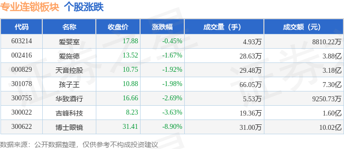 | 代码 | 名称 | 收盘价 | 涨跌幅 | 成交量(手) | 成交额(元) | | | --- | --- | --- | --- | --- | --- | --- | | 603214 | 爱歌室 | 17.88 | -0.45% | 4.93万 | - | 8810.22万 | | 002416 | 爰施德 | 13.52 | -1.67% | 28.63万 | | 3.88 Z | | 000829 | 天音控股 | 10.75 | -1.92% | 29.48万 | | 3.18亿 | | 301078 | 孩子王 | 10.88 | -1.98% | 1 66.05万 | | 7.30亿 | | 300755 | 华致酒行 | 16.66 | -2.69% | 5.53万 | | 9250.73万 | | 300022 | 吉峰科技 | 8.23 | -3.63% | 19.36万 | | 1.60亿 | | 300622 | 博士眼镜 | 31.41 | -8.90% | 31.00万 | | 10.02亿 | 从资金流向上来看,当日专业连锁板块主力资金净流出2.21亿元,游资资金净流入44 ...