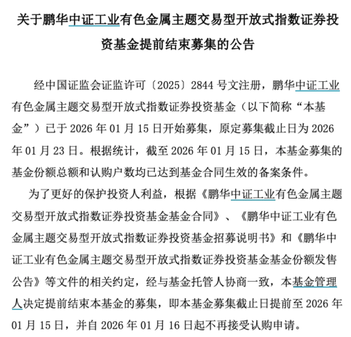 鹏华基金发布关于鹏华中证工业有色金属主题交易型开放式指数证券投资基金提前结束募集的公告。 (基金公告) 公告显示,本基金于2026年01月15日启动募集,原定募集截止日为2026年01月23日。截至募集首日,基金份额总额与认购户数均已满足基金合同生效的备案 条件。为更好保护投资人利益,基金管理人依据《基金合同》《招募说明书》及《基金份额发售公告》相关约定,经与基金托管人协商一致,决定提前结束 募集,募集截止日由原定的2026年01月23日调整为2026年01月15日,并自2026年01月16日起停止接受认购申请。 ...